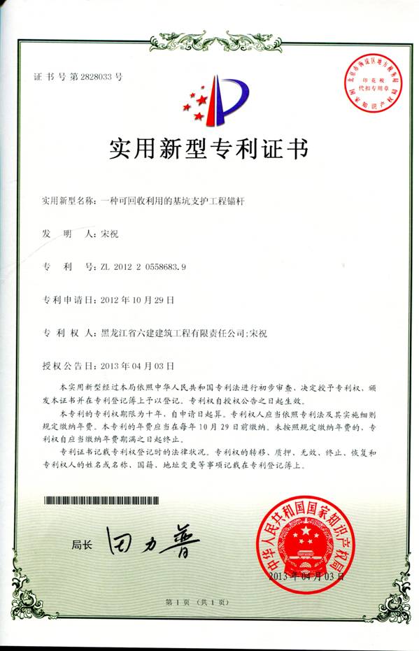 省六建公司申请的实用新型专利——“一种可回收利用的基坑支护工程锚杆”,已顺利通过中华人民共和国国家知识产权局专利局的审批,并于
