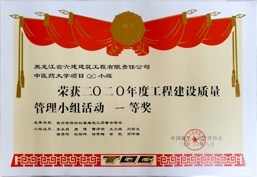 省六建公司承建的黑龙江中医药大学项目荣获2020年度国家级工程建设质量管理小组活动一等奖