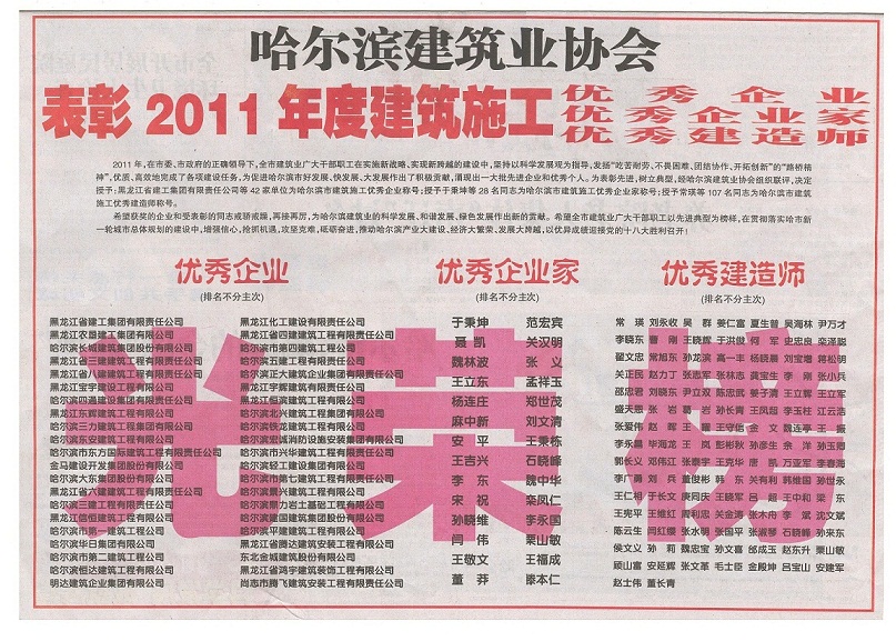 近日,从哈尔滨建筑业协会传来喜讯,黑龙江省六建建筑工程有限责任公司在表彰2011年度建筑施工优秀企业、优秀企业家、优秀建造师活动中成绩卓著,集体、个人共获得了四项殊荣。在集体评比中,获得了“哈尔滨市2011年度建筑施工优秀企业”称号;在个人评比中,省六建公司总经理宋祝同志获得“哈尔滨市2011年度建筑施工优秀企业家”称号,建造师李永昌、毕海龙获得“哈尔滨市2011年度建筑施工优秀建造师”称号。这是省六建公司在哈尔滨市建筑施工评比中的又一次突破,也是以宋经理为领导的全公司员工共同努力的结果。